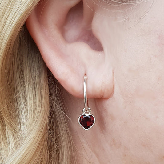 Garnet Heart Sterling Silver Hoop Earrings