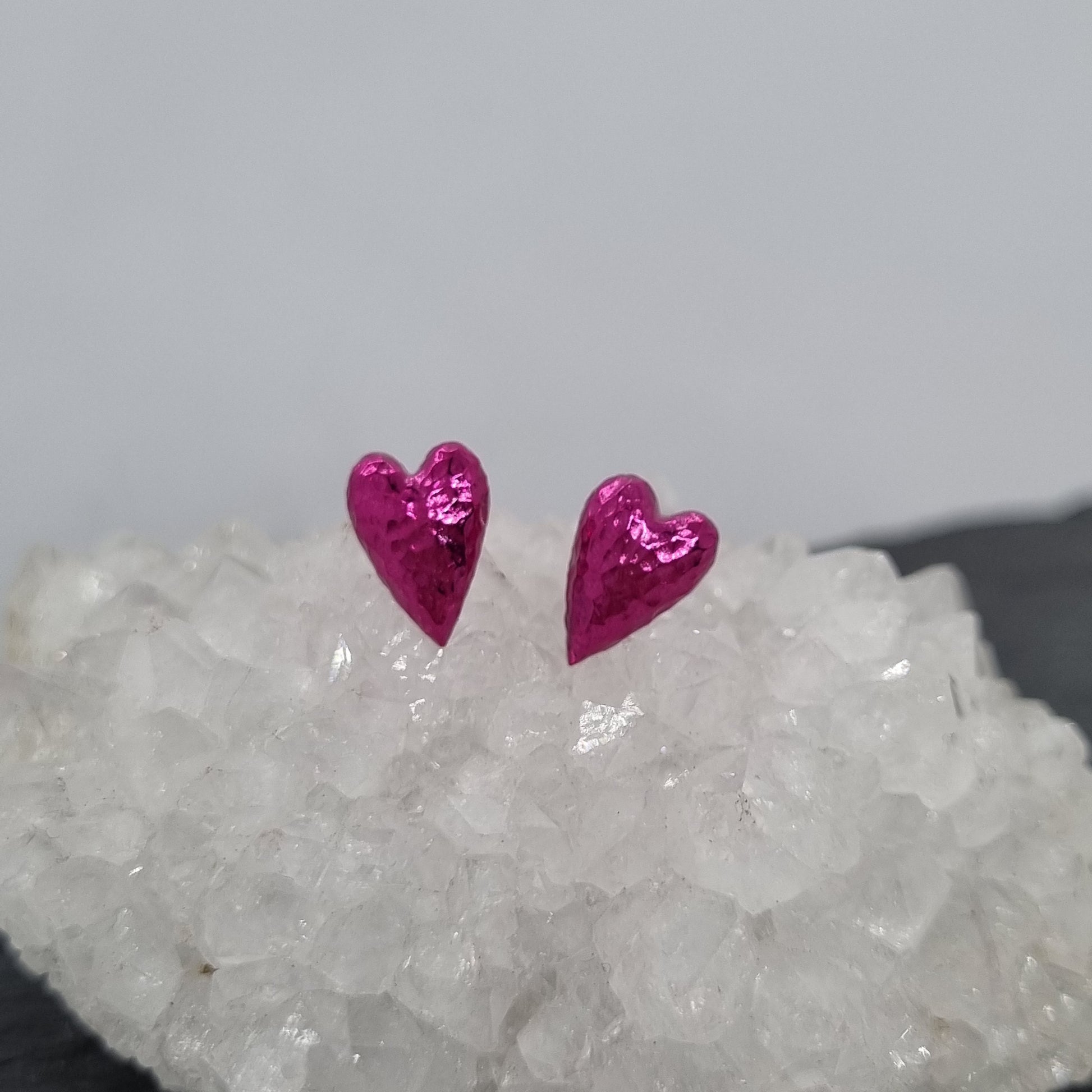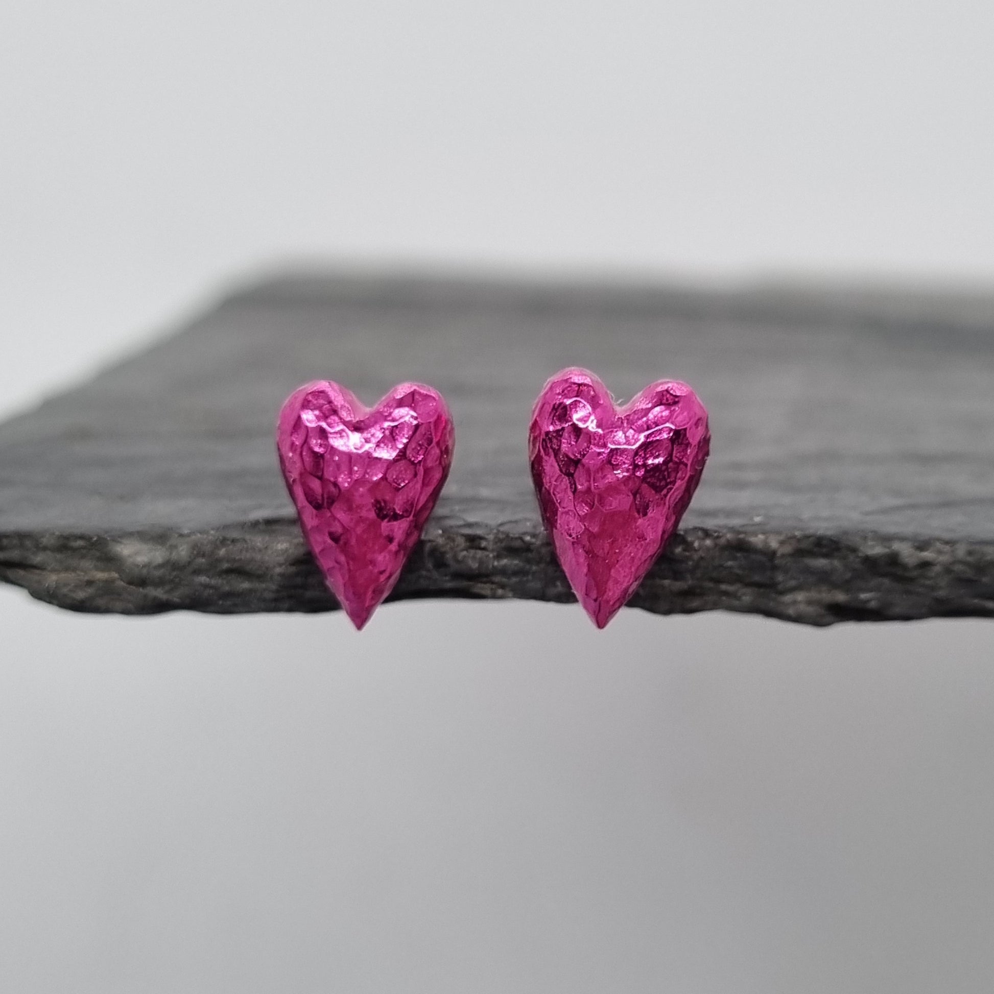 Textured sterling silver heart stud earrings nano-ceramic coated in pink.