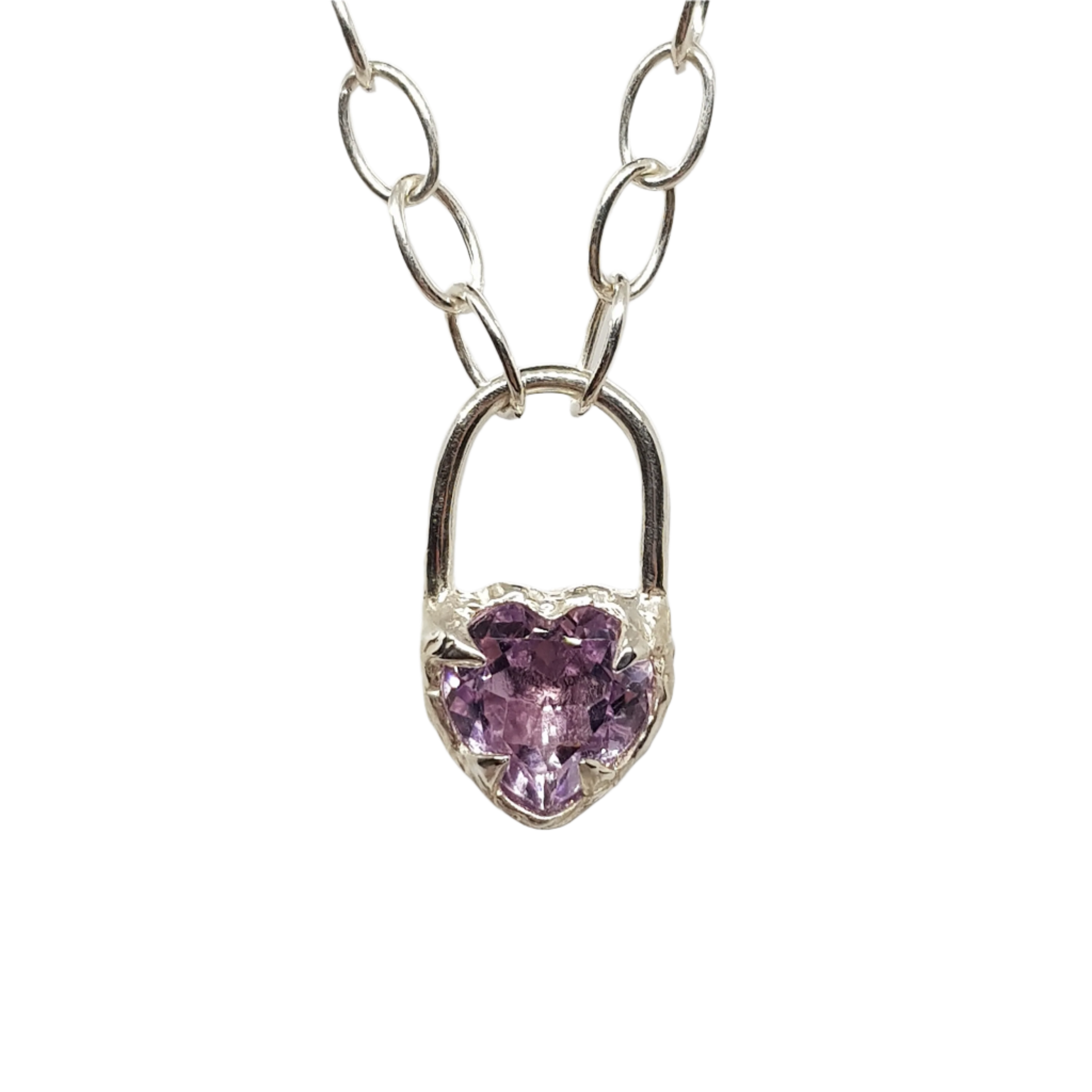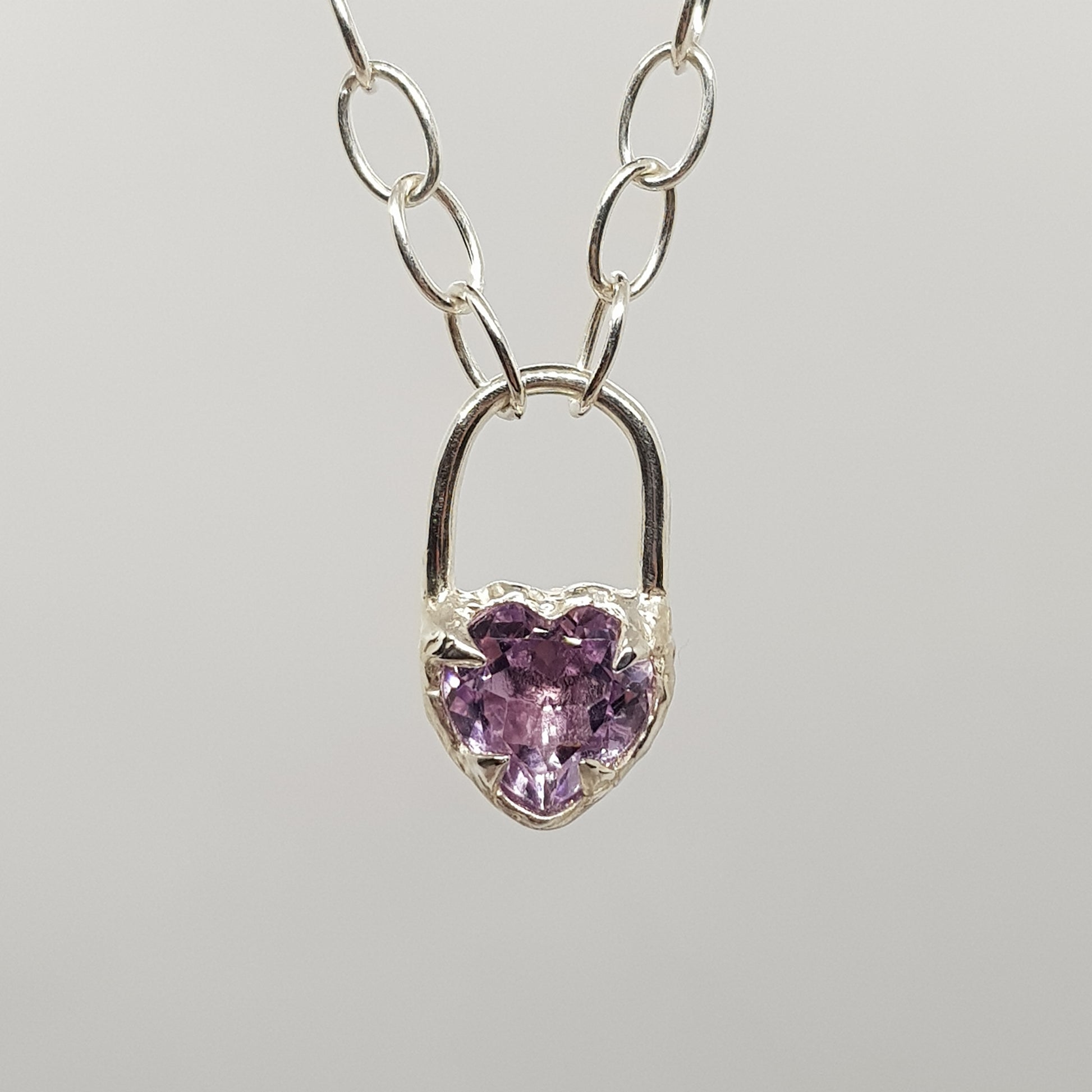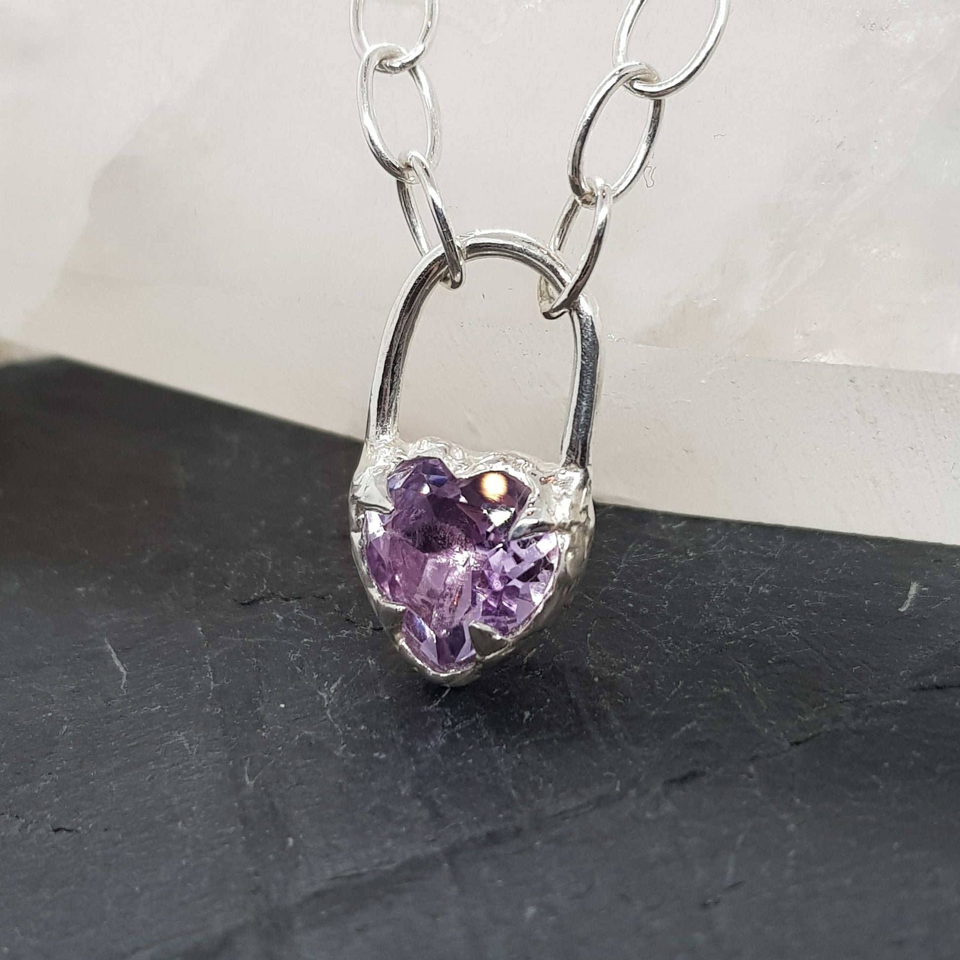 A 10mm faceted natural amethyst heart set in uniquely textured chunky solid sterling silver.
