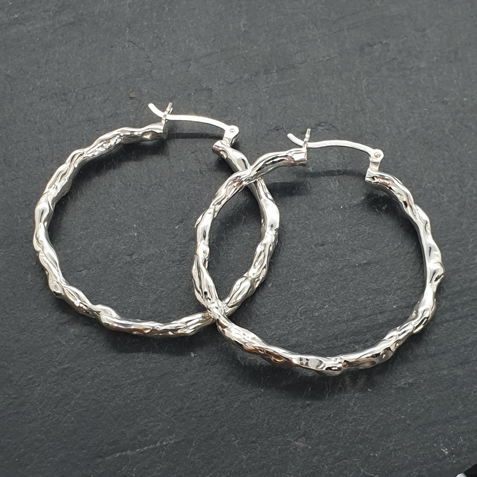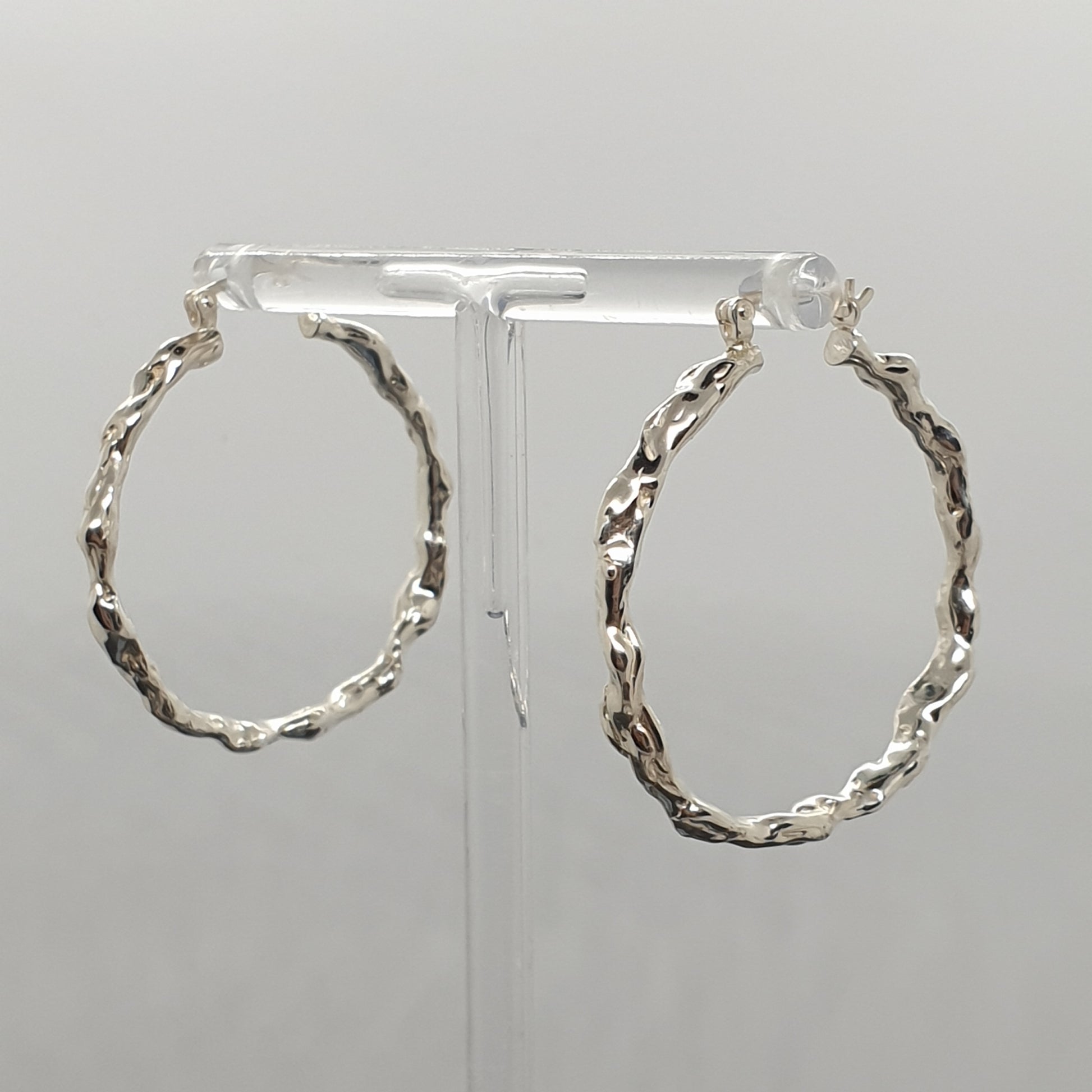 A pair of solid sterling silver molten textured hoop latch closing earrings.