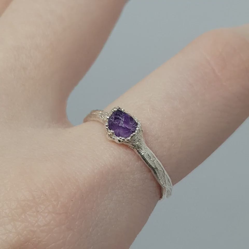 A solid silver ring with a natural raw piece of amethyst set in uniquely textured silver.