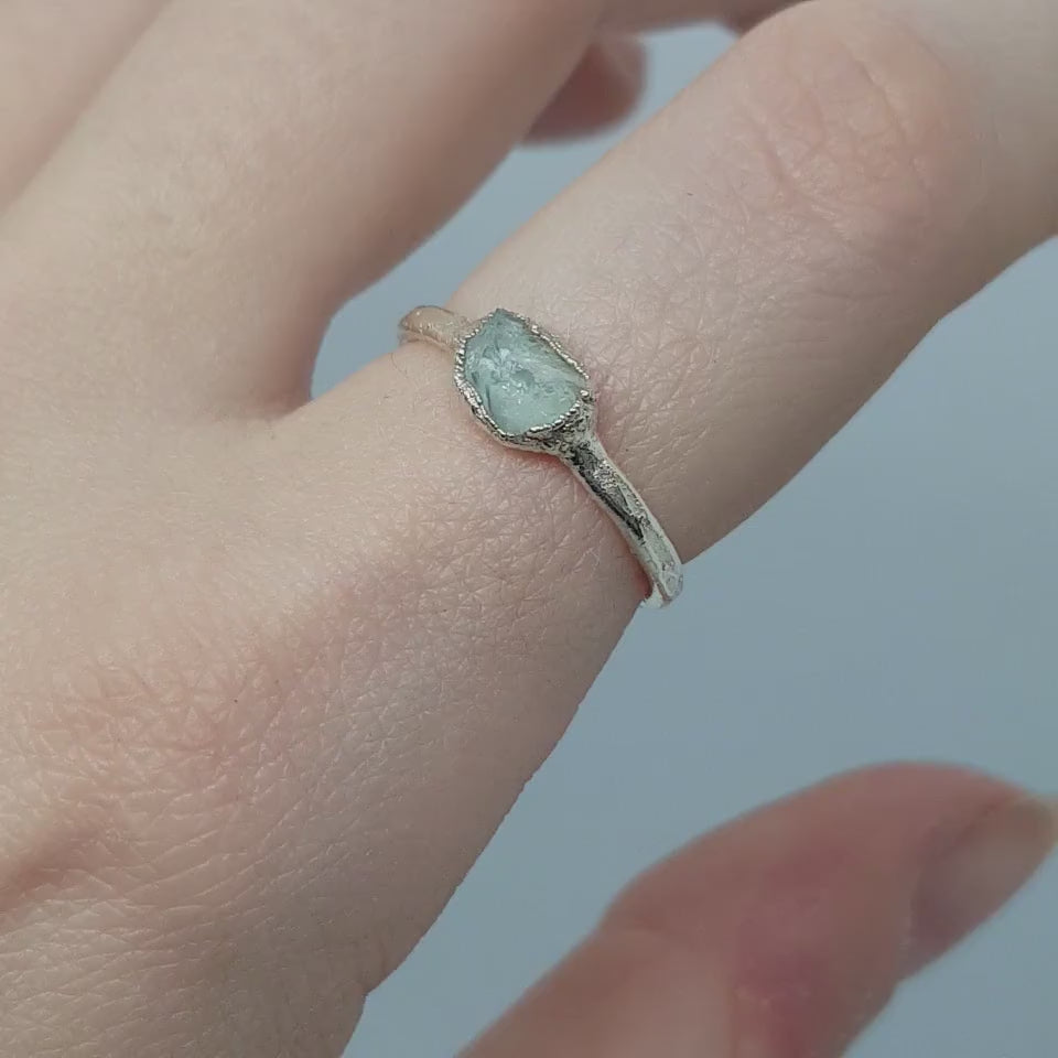 A stunning piece of raw aquamarine, a soft pastel blue stone, set in uniquely textured silver.