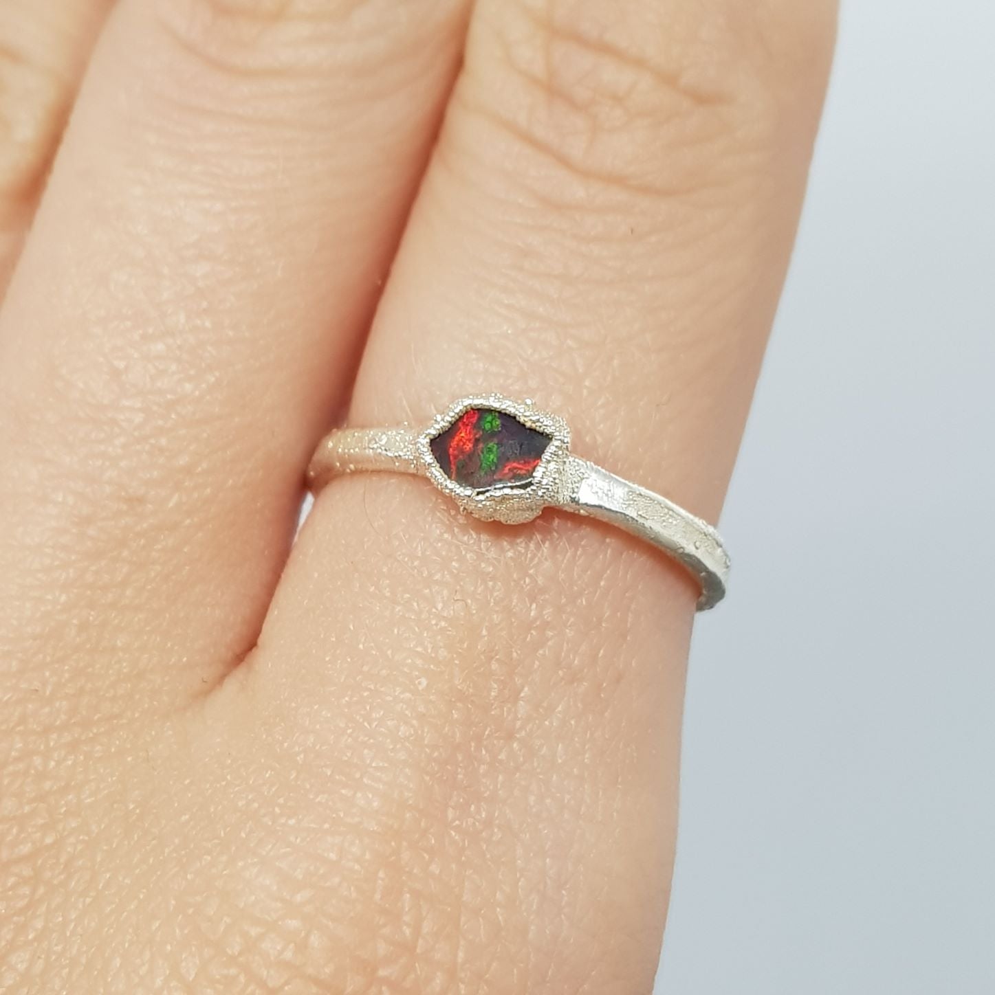 A stunning piece of black opal with red and green flashes of colour, set in uniquely textured solid silver.