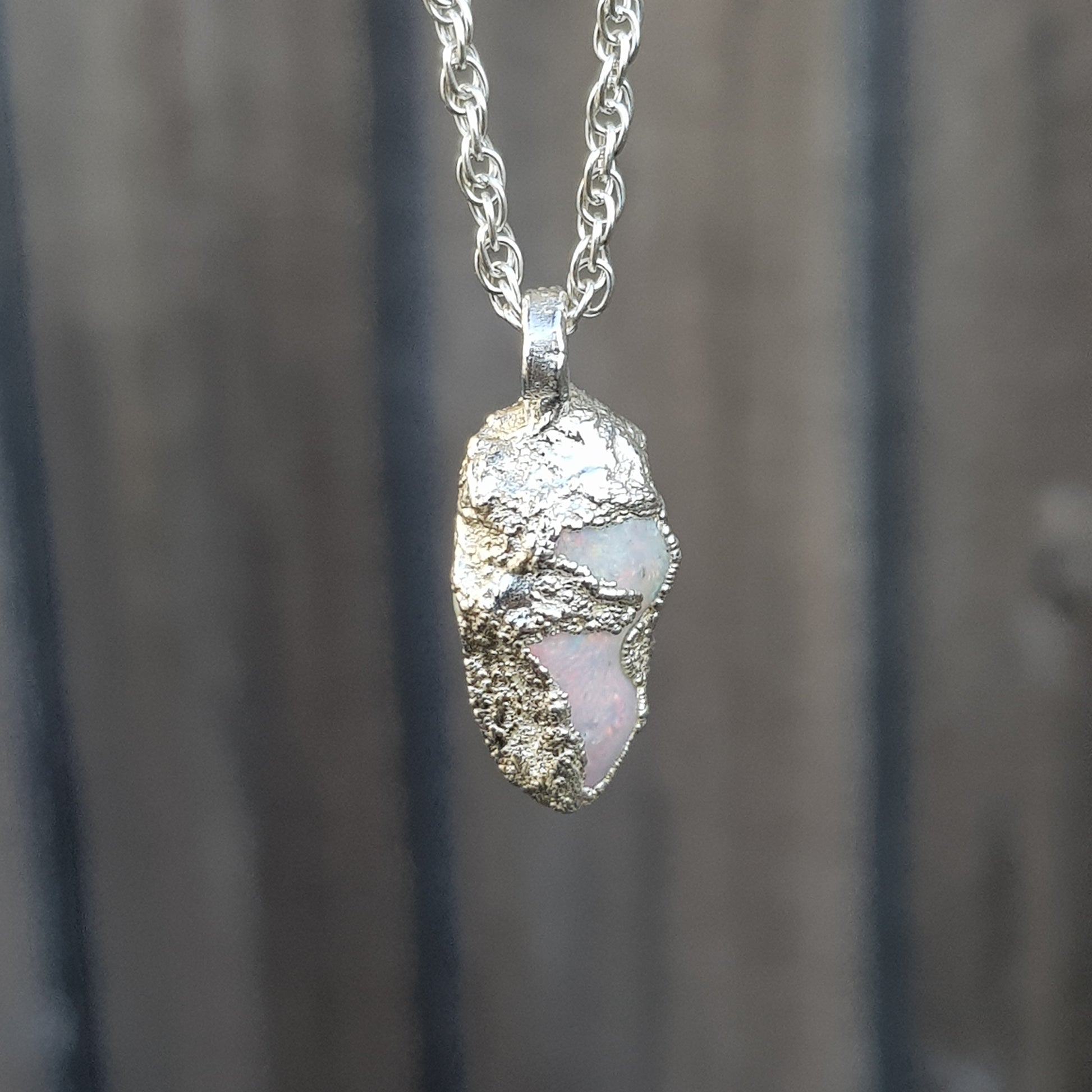 A unique piece of raw Australian opal, encased in solid silver with a unique freeform texture. This pendant comes on a 60cm sterling silver rope chain.