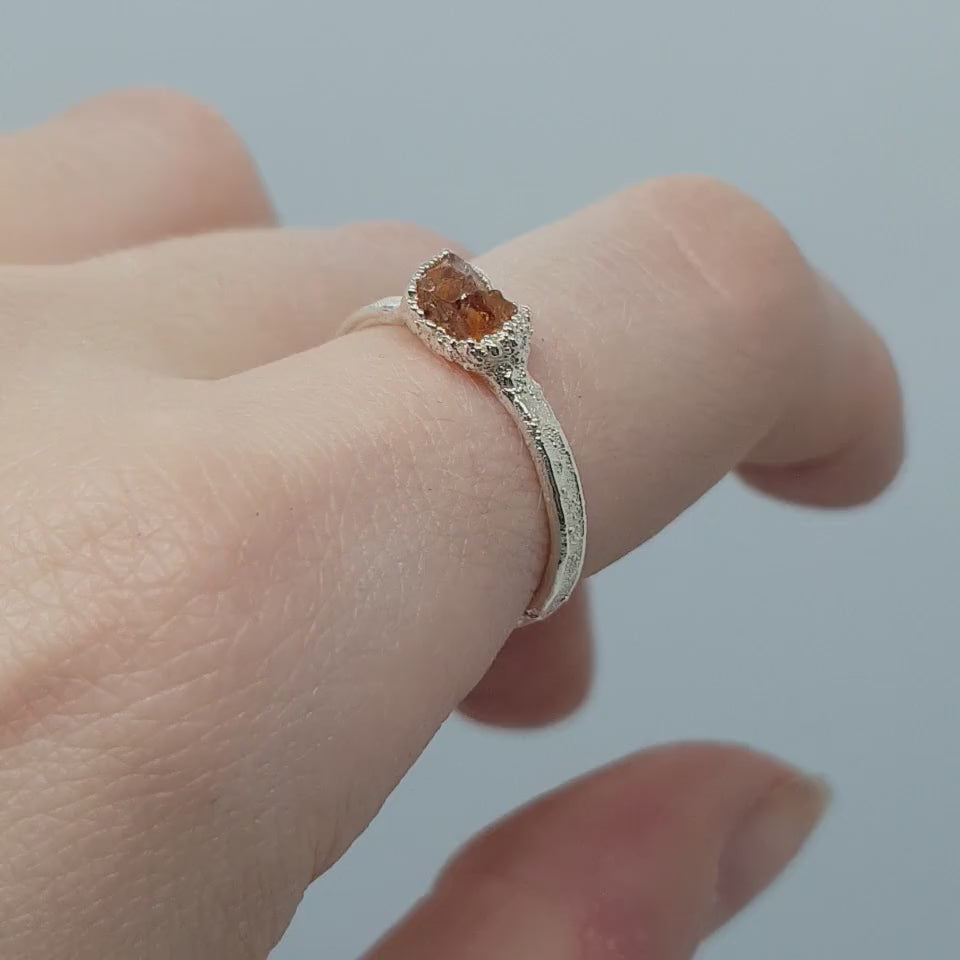 A raw natural mandarin garnet encased in uniquely textured solid silver.