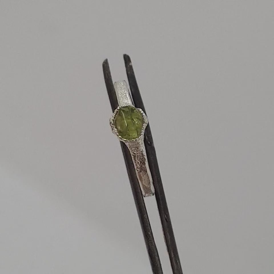 A solid silver ring with a stunning raw peridot set in uniquely textured silver.