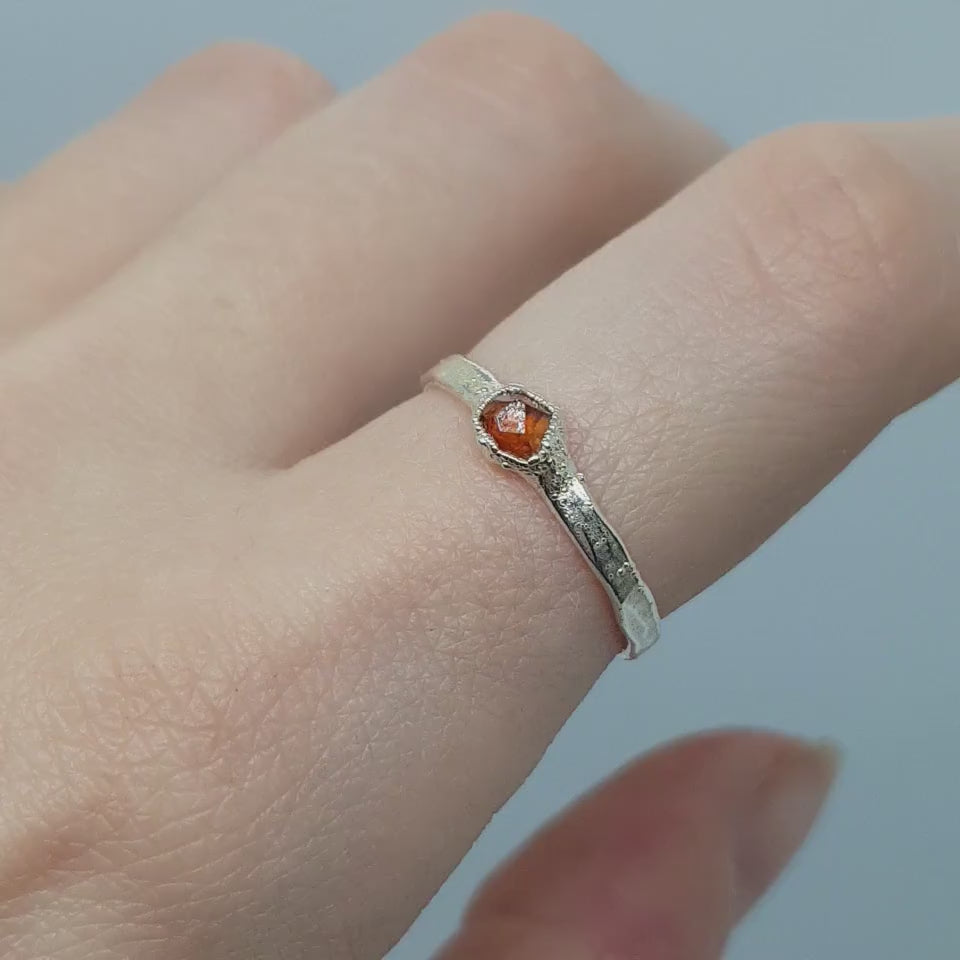 A raw natural spessartite (also known as spessartine) garnet crystal encased in uniquely textured solid silver.