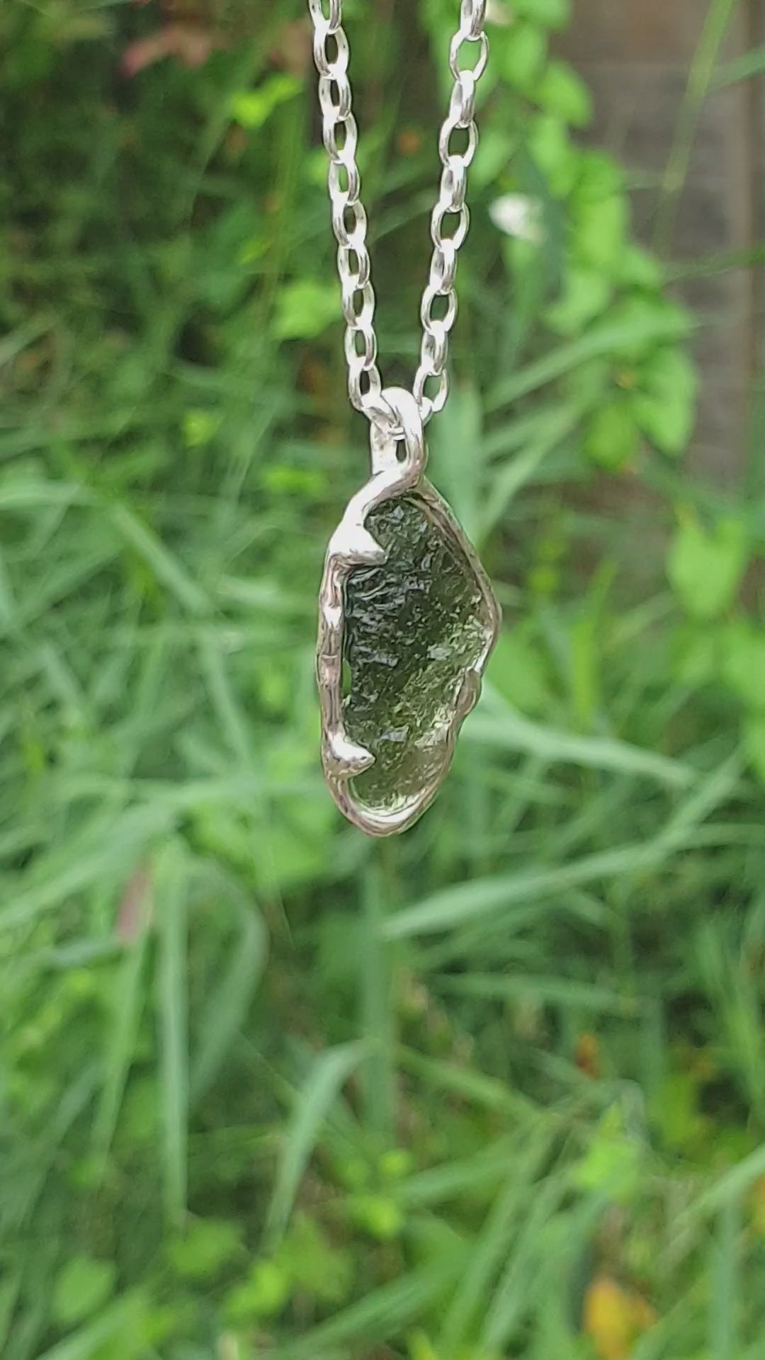 A stunning large piece of genuine moldavite set in a handmade sterling silver molten setting.