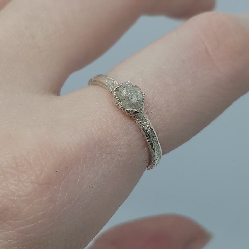 A natural white raw conflict-free diamond encased in uniquely textured silver.