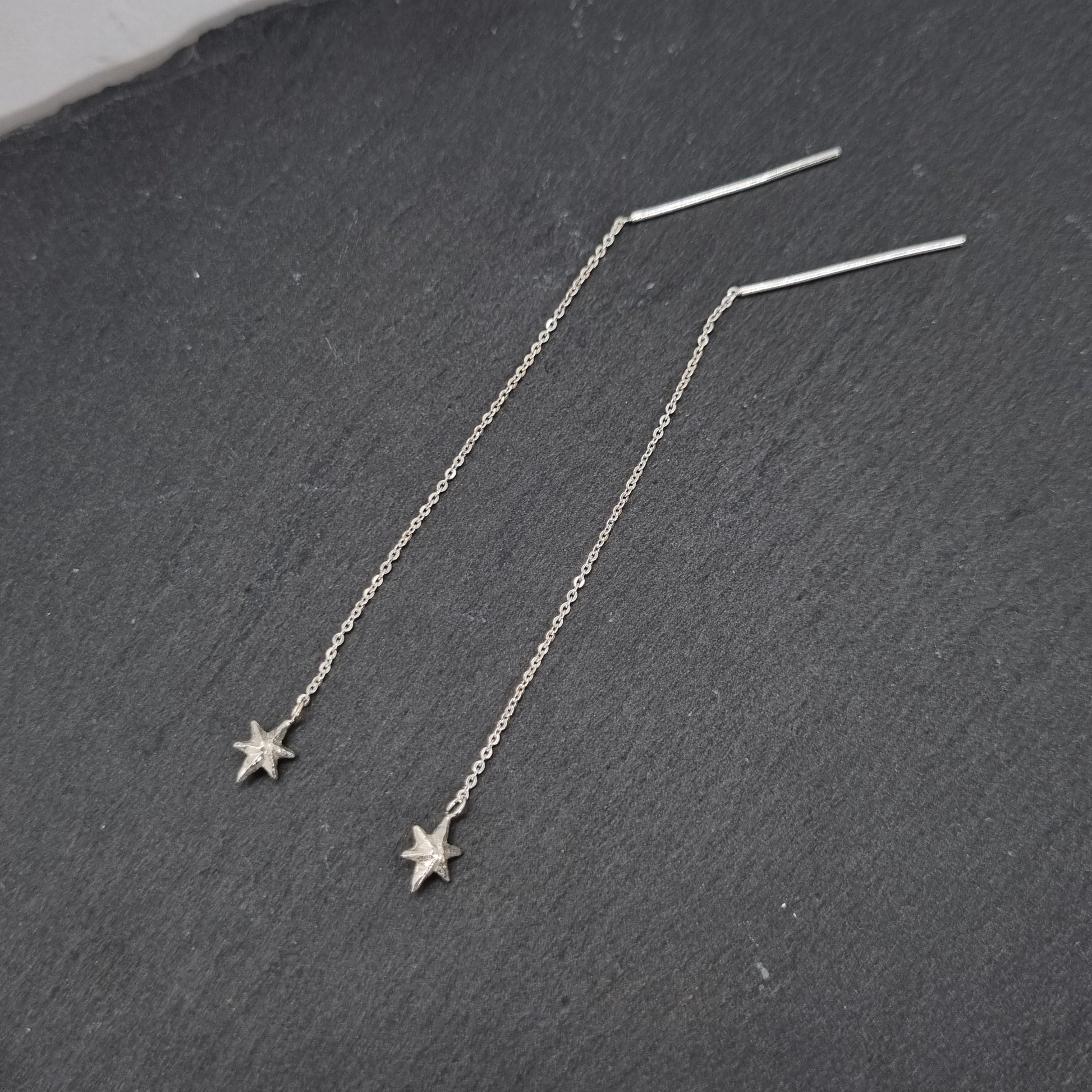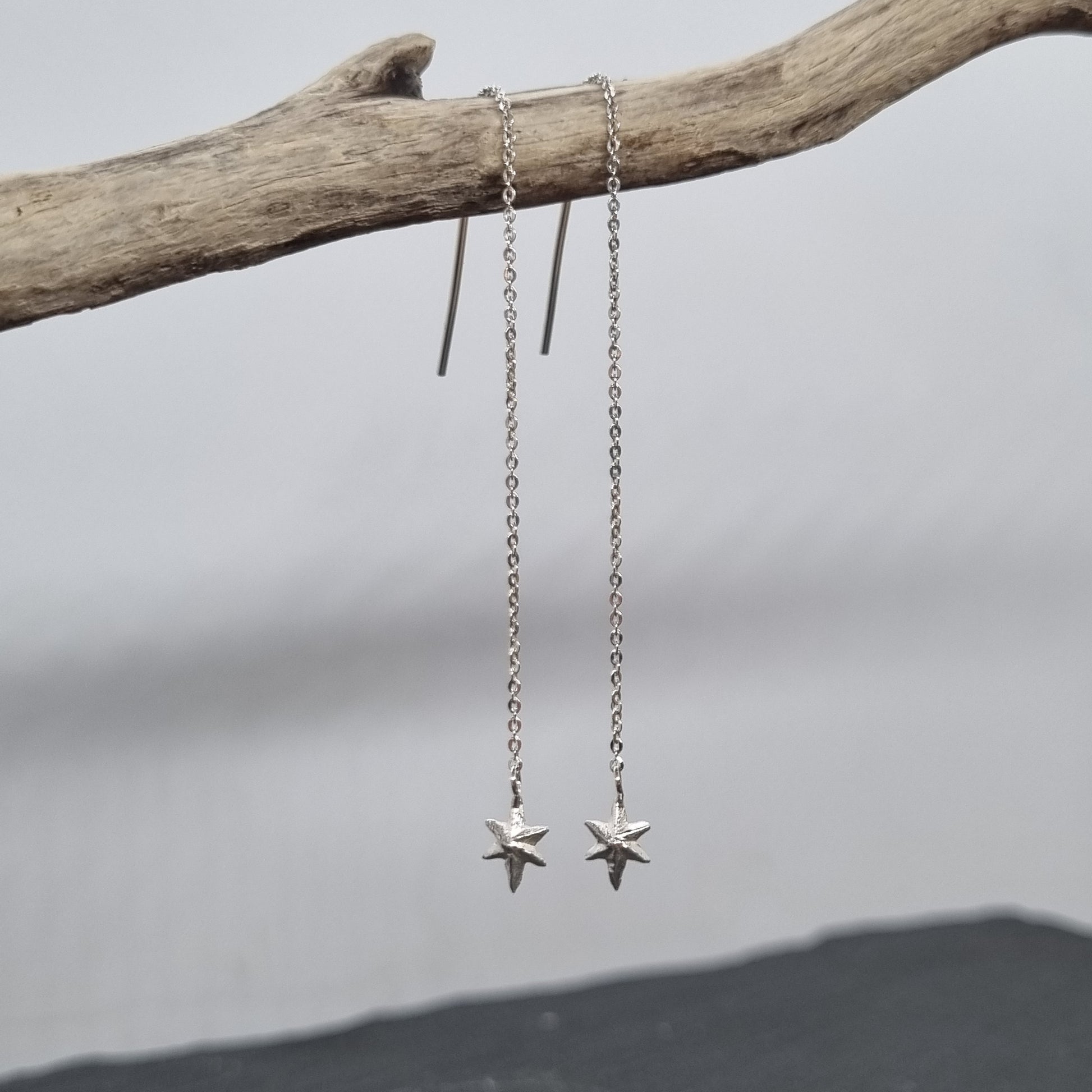 Tiny facet stars hang on a fine chain that threads through the ear, sterling silver.