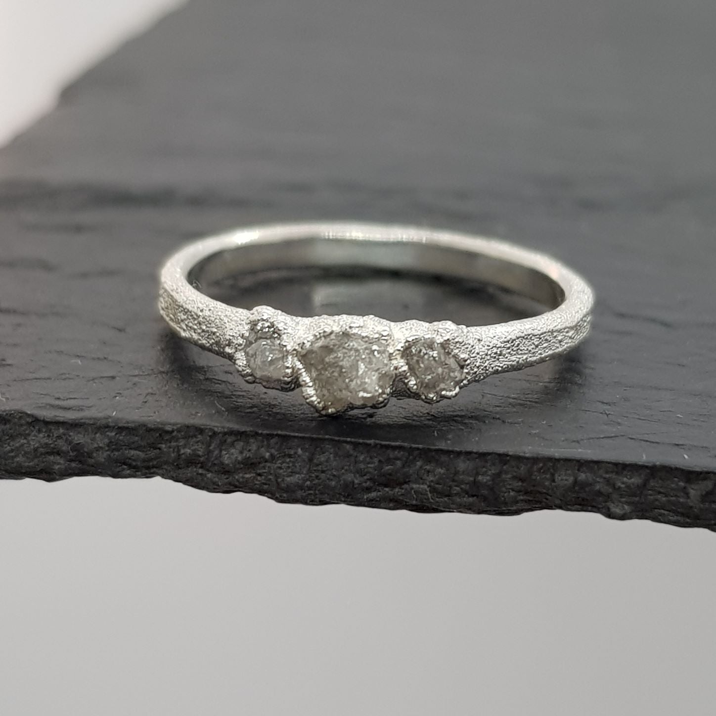 Three natural raw white diamonds encased in uniquely textured solid silver.